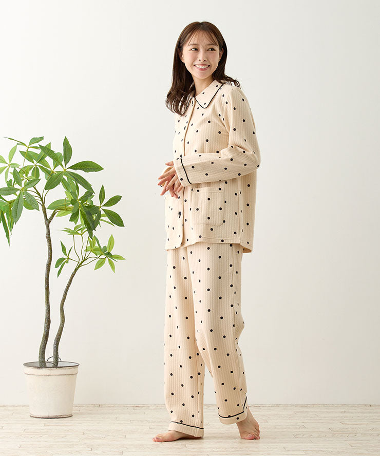 やわらかい肌触りの良い綿100%キルトニットのテーラードレディースパジャマ上下セット。